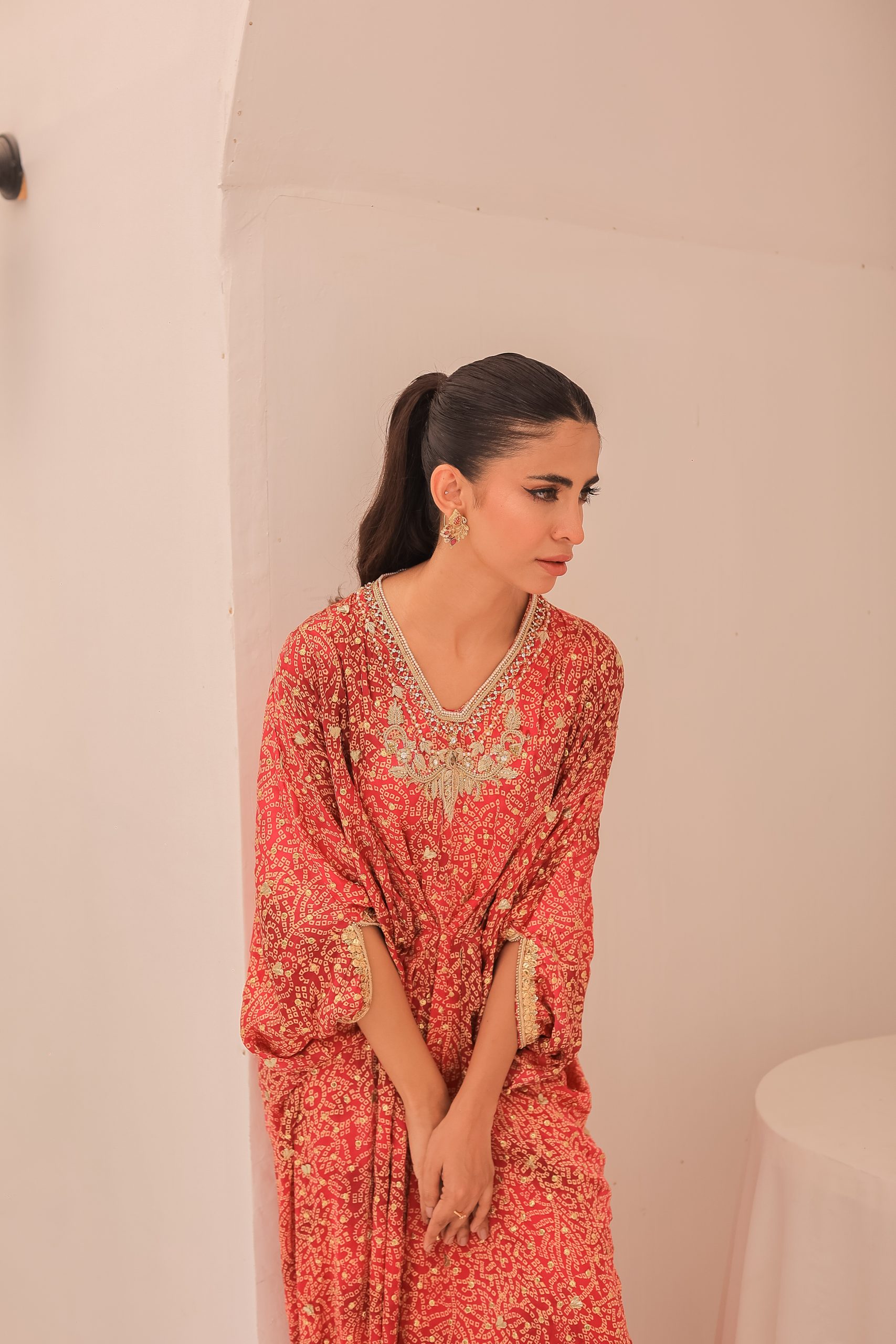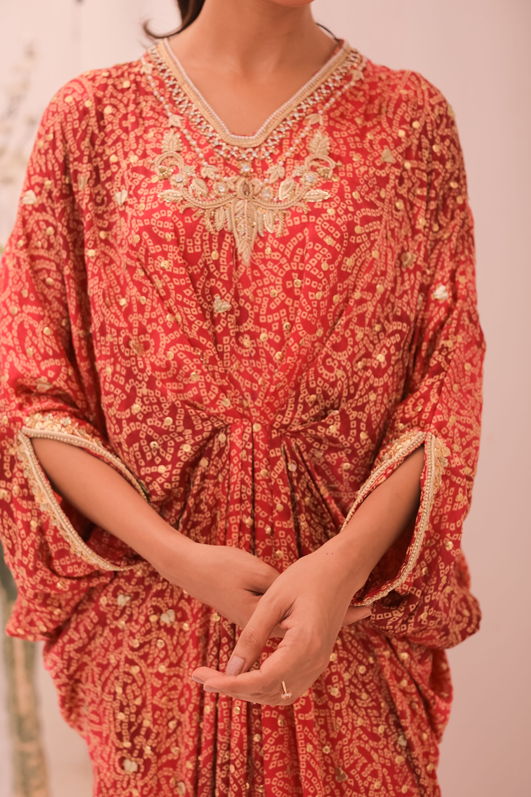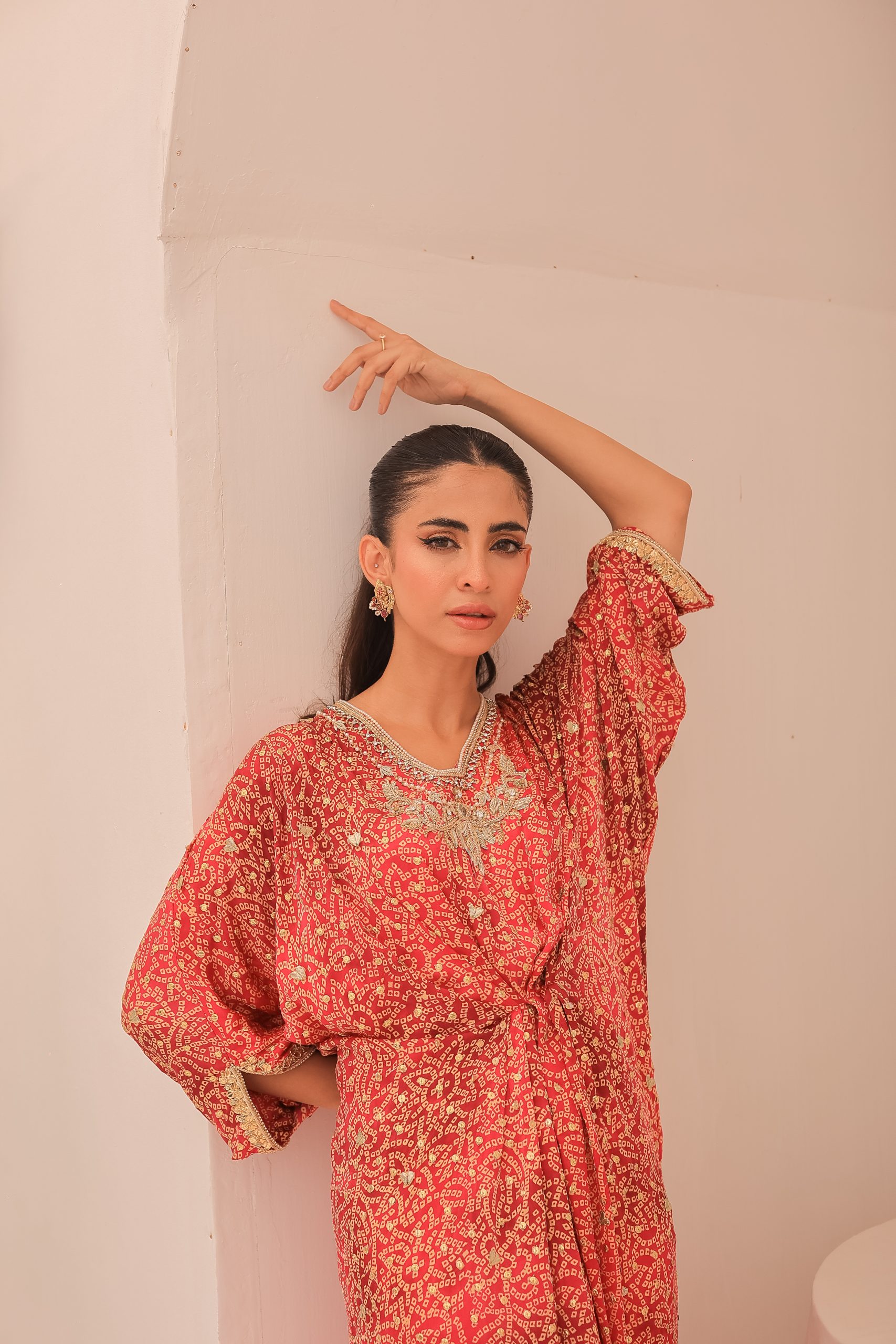 This formal kaftan is made from pure silk, showcasing the traditional art of Bandhani print. The luxury formal is adorned with intricate hand-embellished zardozi and Gota work, adding a touch of opulence and elegance. The vibrant patterns of Bandhani, combined with the shimmering embellishments, make this kaftan a stunning piece perfect for special occasions. The flowing feature of pure silk ensures both comfort and style, while the detailed craftsmanship highlights the timeless beauty of traditional Indian artistry.