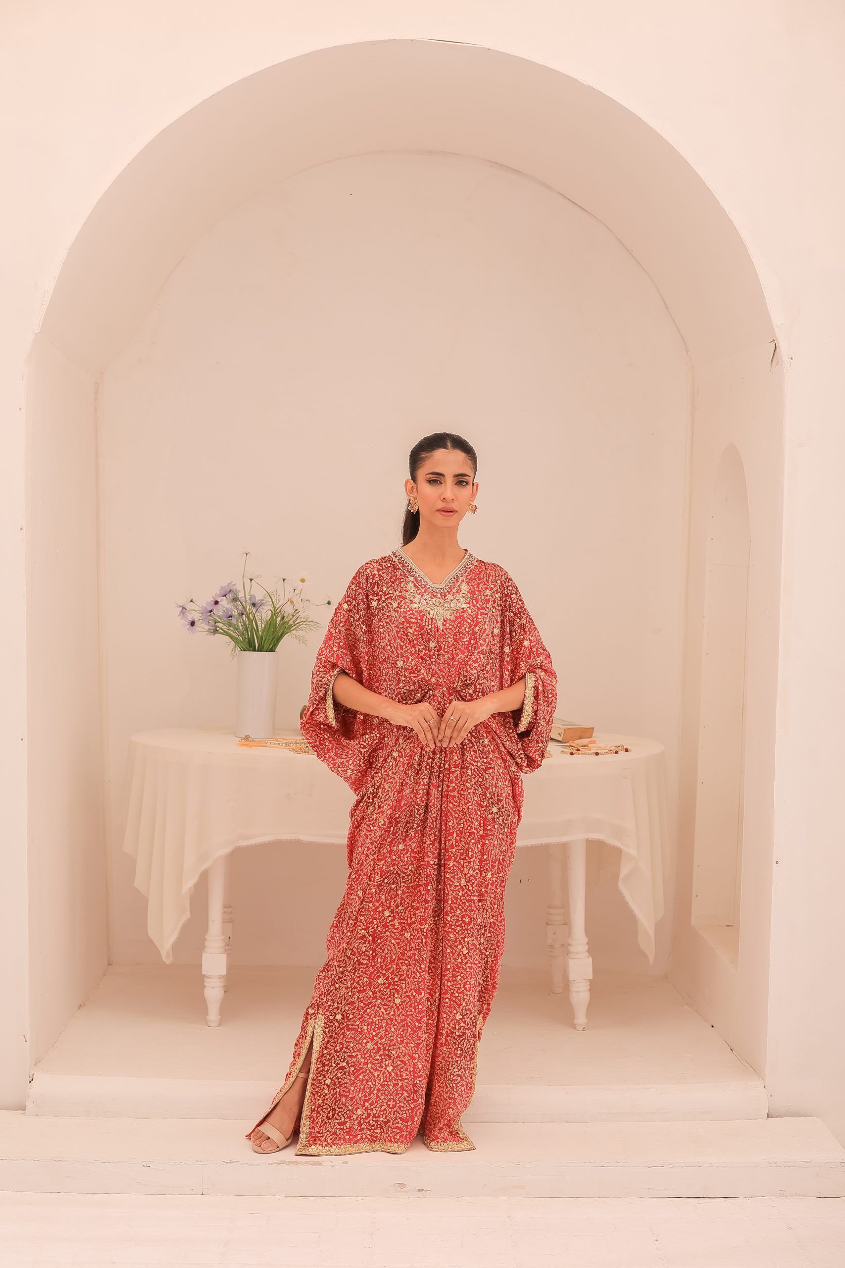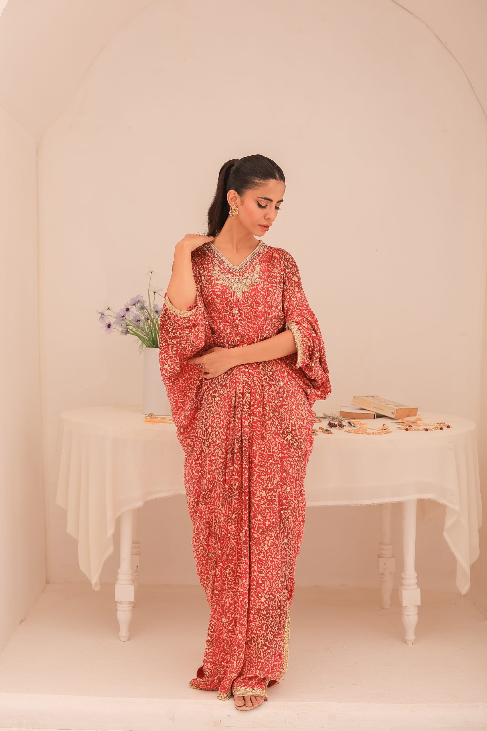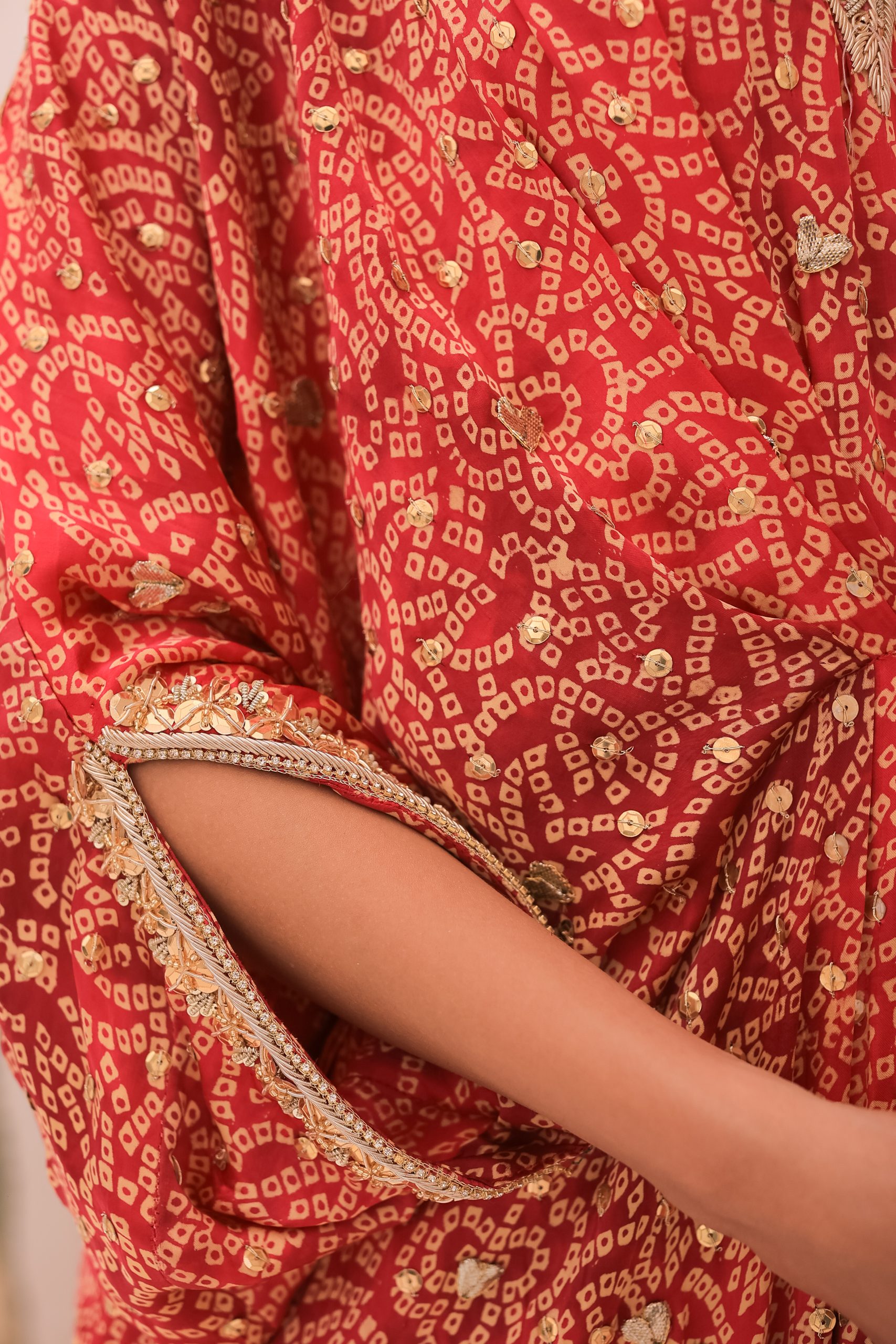 This formal kaftan is made from pure silk, showcasing the traditional art of Bandhani print. The luxury formal is adorned with intricate hand-embellished zardozi and Gota work, adding a touch of opulence and elegance. The vibrant patterns of Bandhani, combined with the shimmering embellishments, make this kaftan a stunning piece perfect for special occasions. The flowing feature of pure silk ensures both comfort and style, while the detailed craftsmanship highlights the timeless beauty of traditional Indian artistry.
