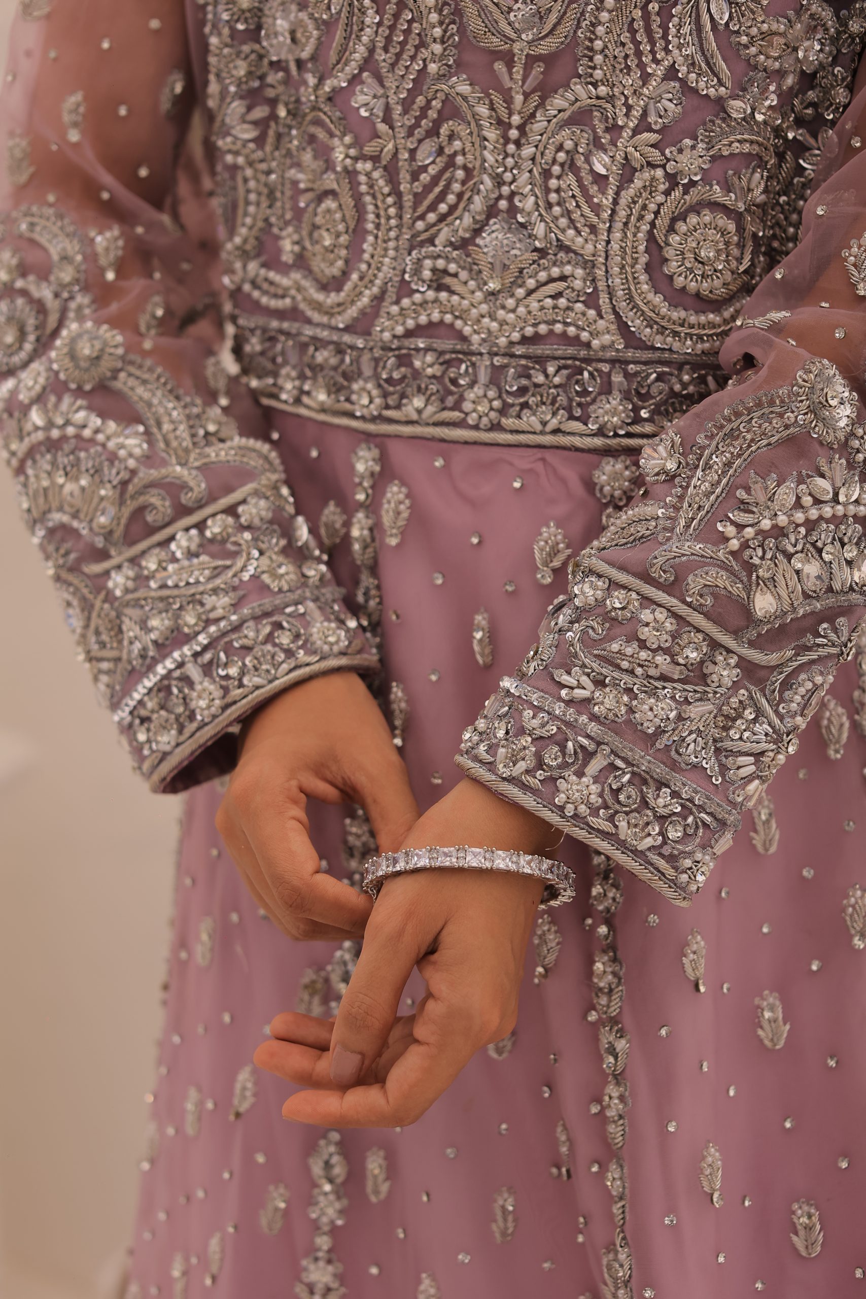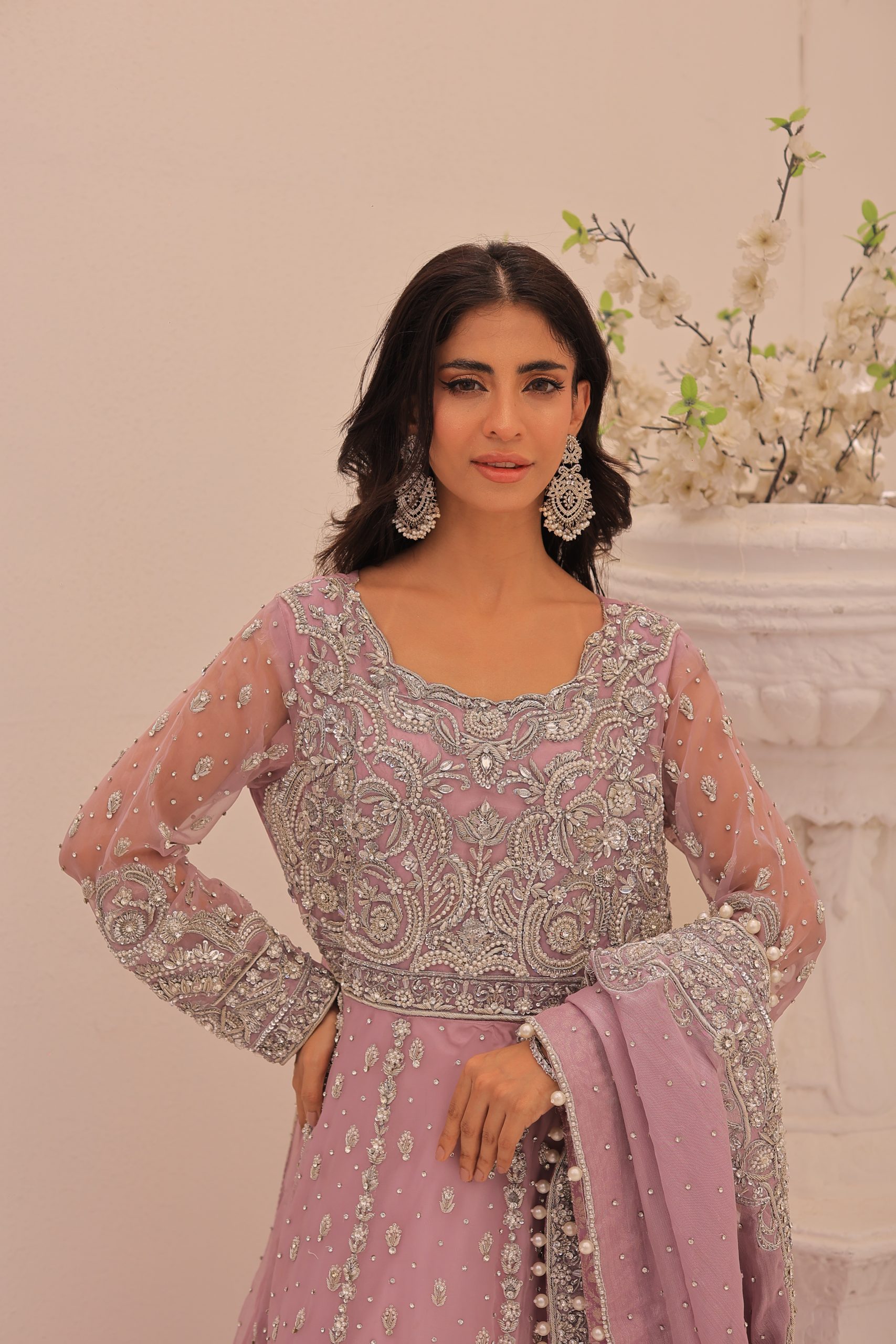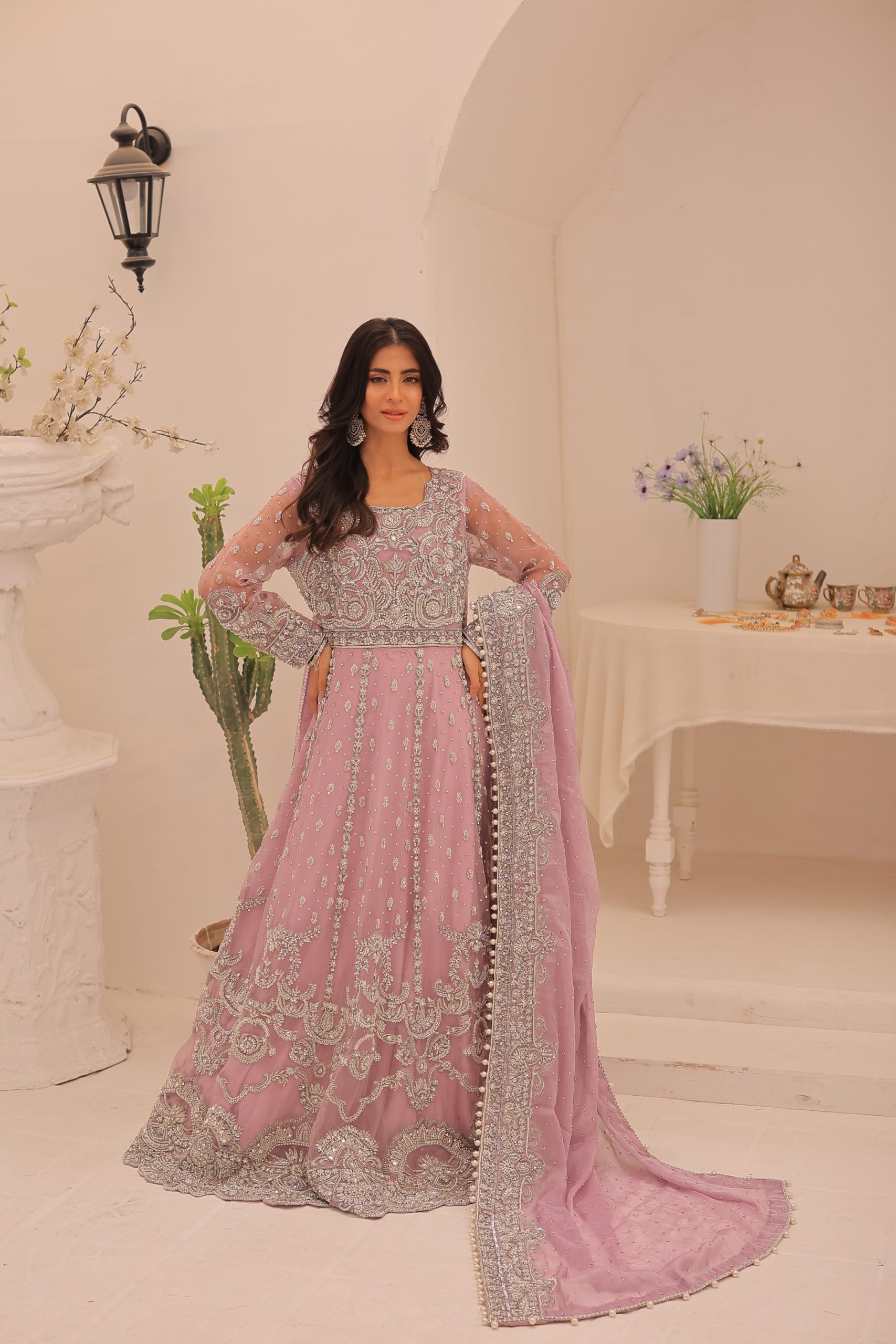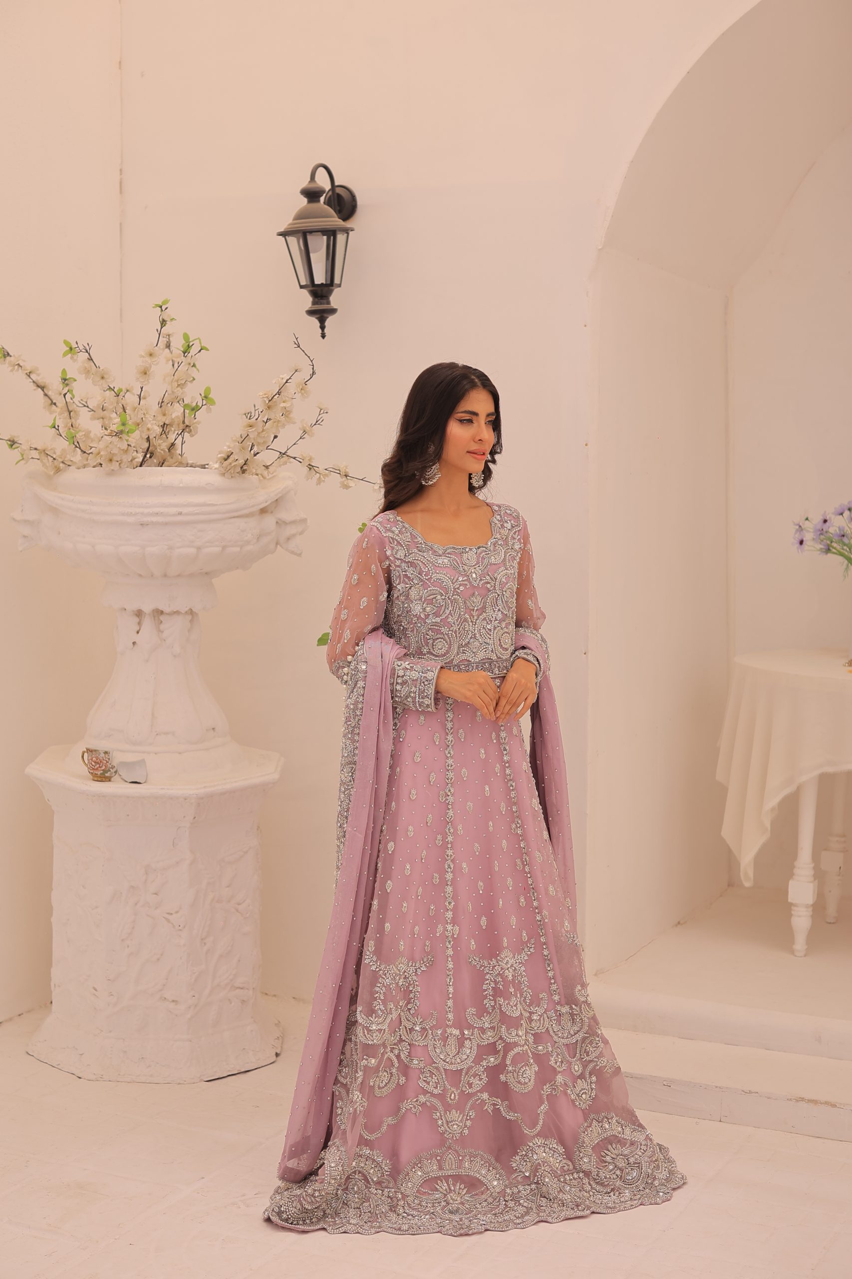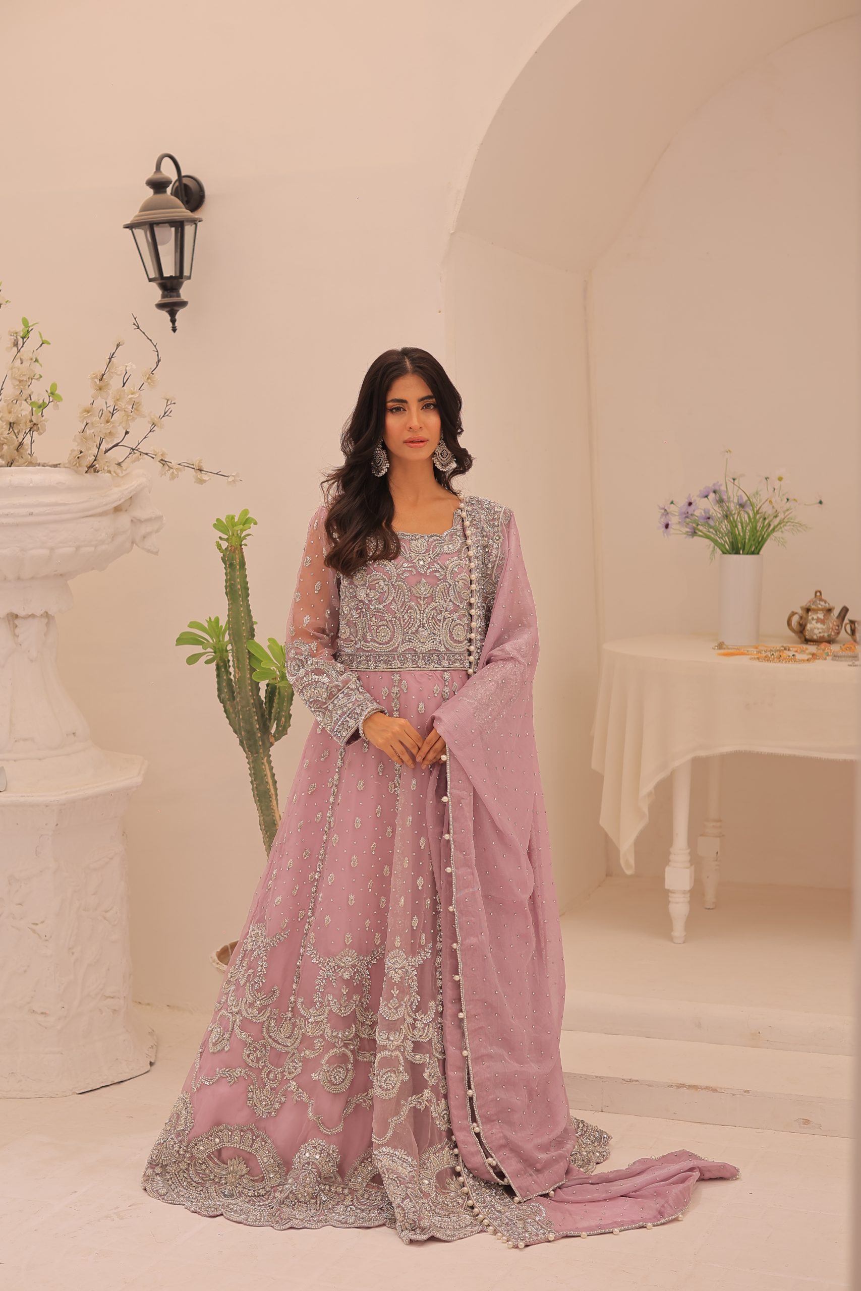 This enchanting lavender bridal maxi dress is crafted from luxurious Kathan organza, offering a graceful and elegant silhouette. This bridal maxi accompanying pure maisuri dupatta complements the dress perfectly. The outfit features a stunning mix of traditional zardozi work with contemporary beads and stones, creating a bejeweled pattern inspired by motifs derived from Persian designs. This intricate and exquisite detailing adds a touch of opulence and sophistication, making this dress ideal for a bride seeking a timeless and memorable look on her special day.