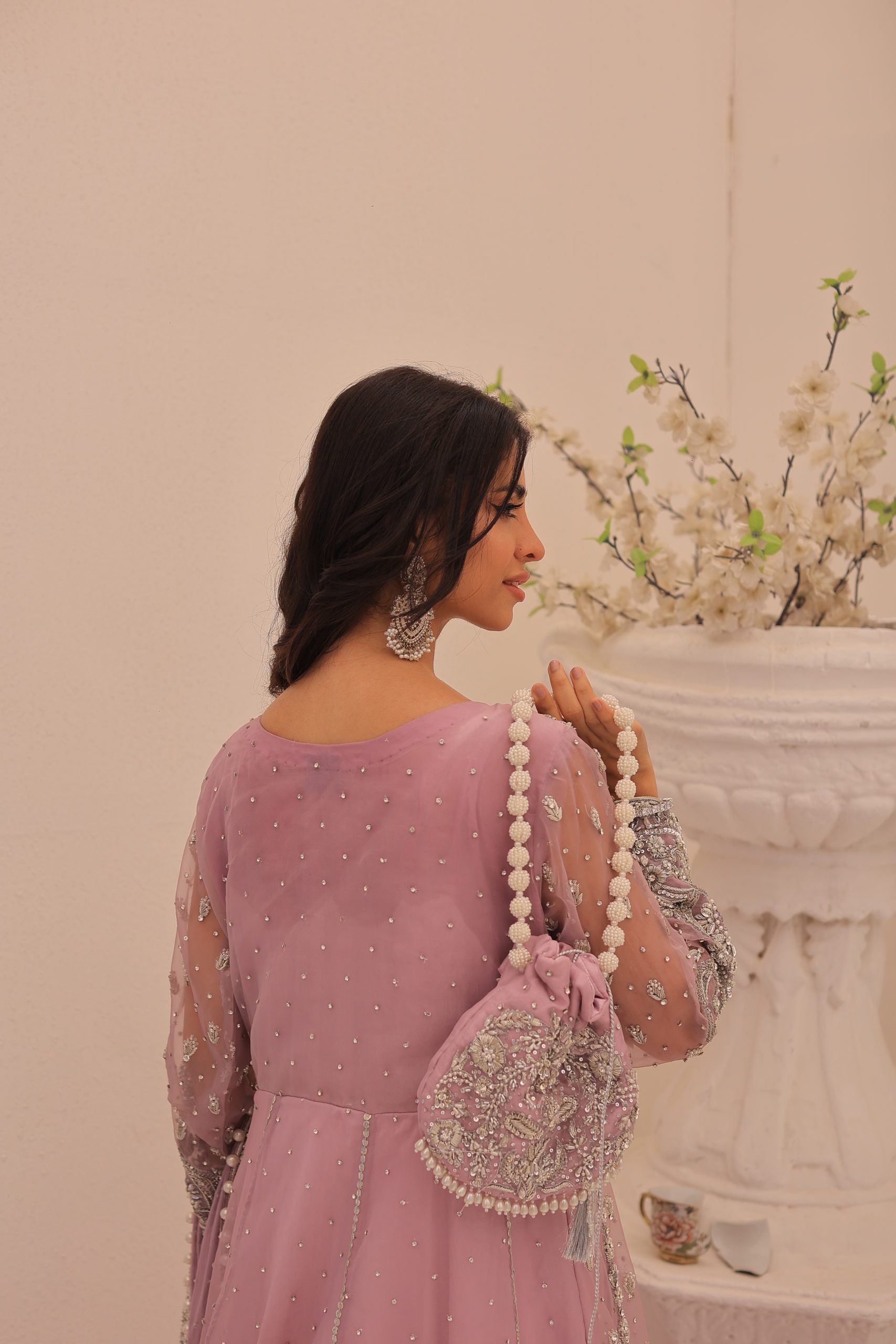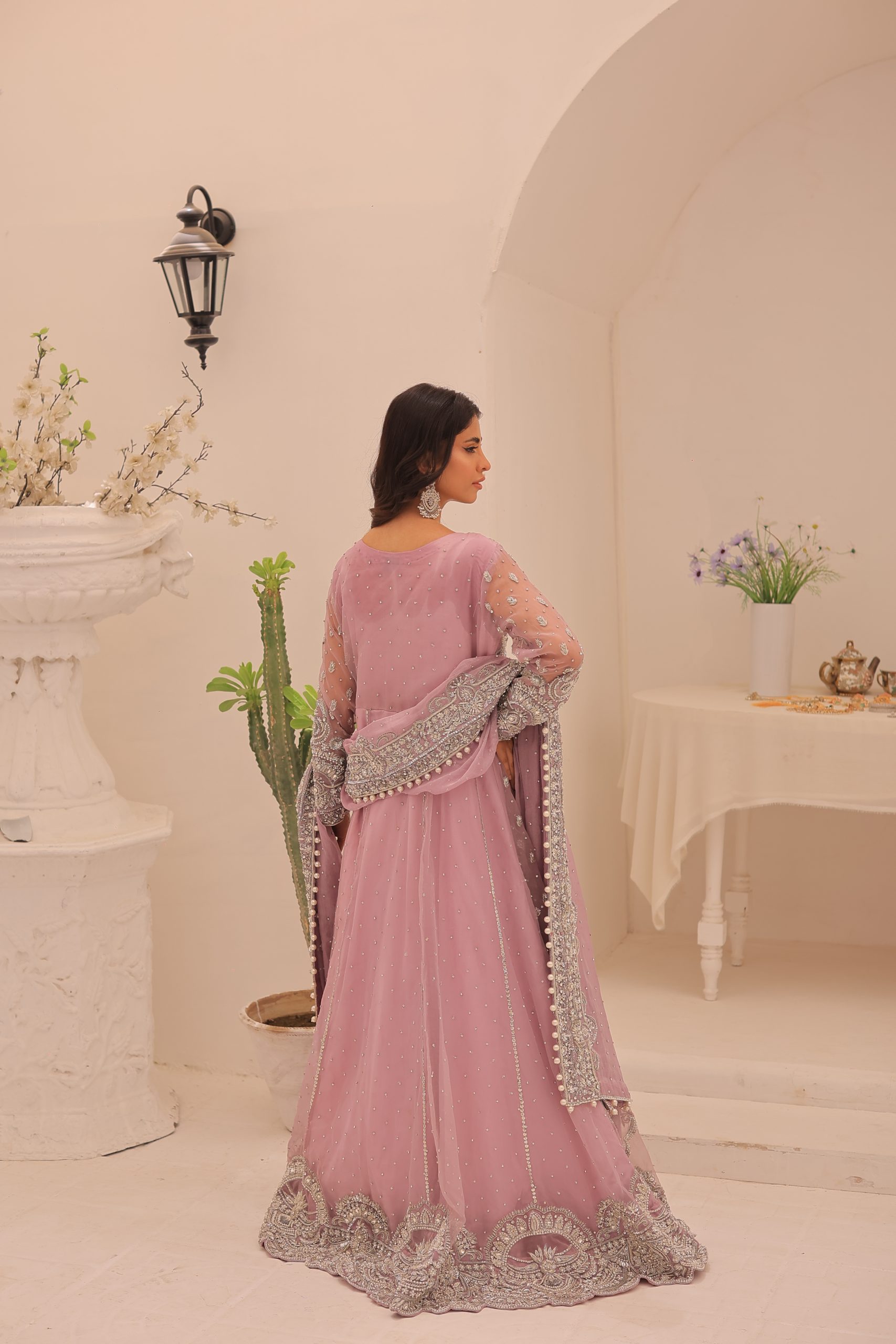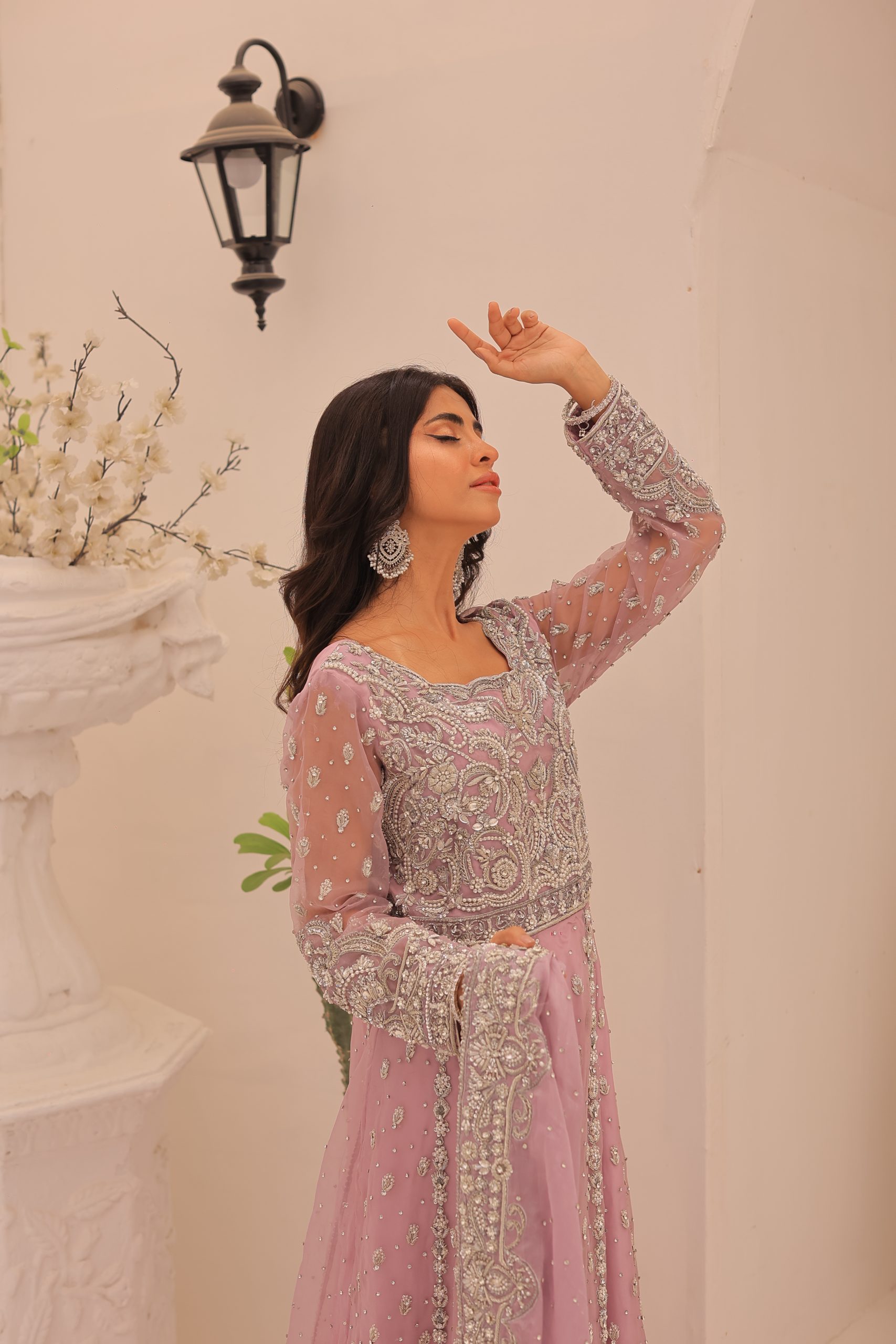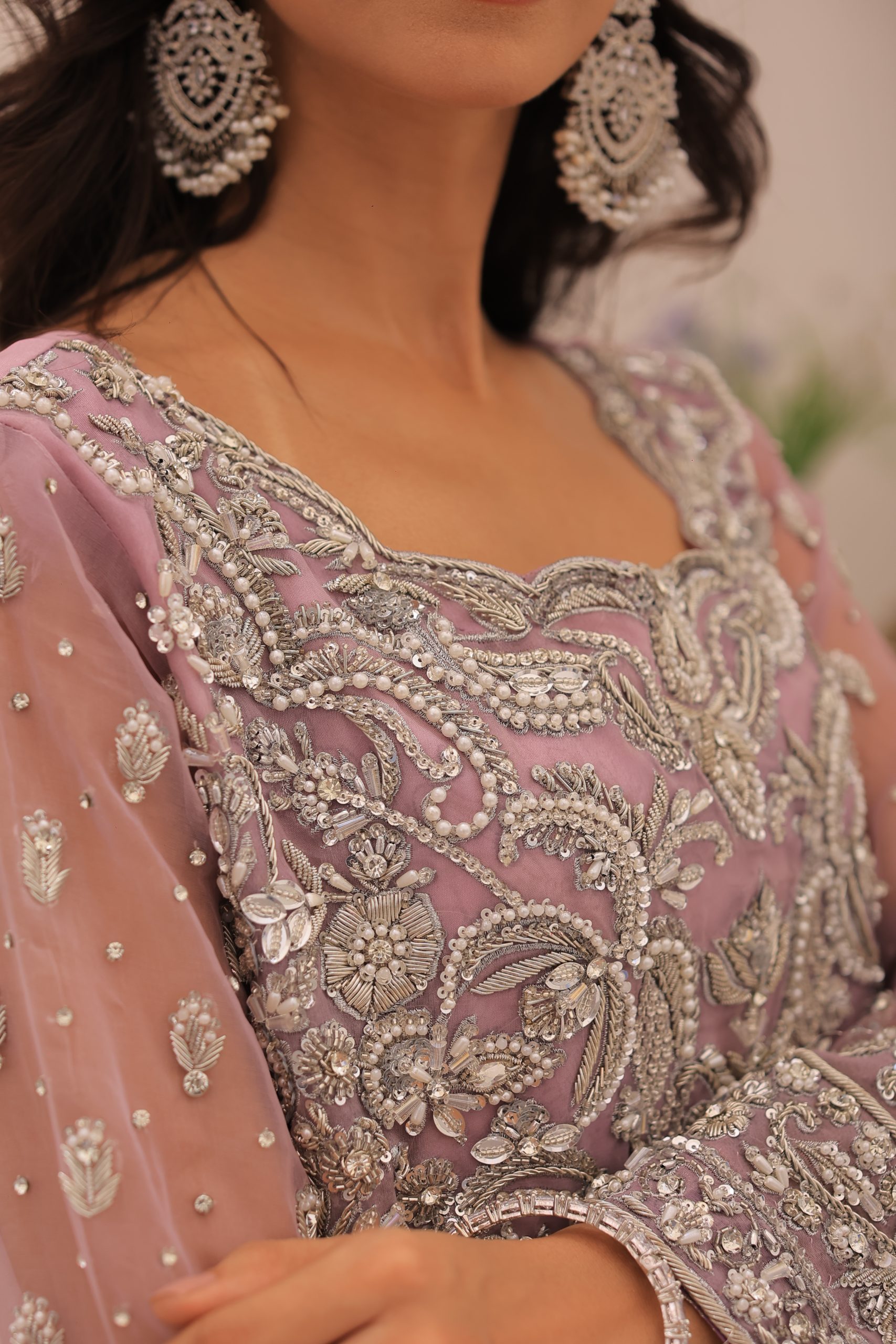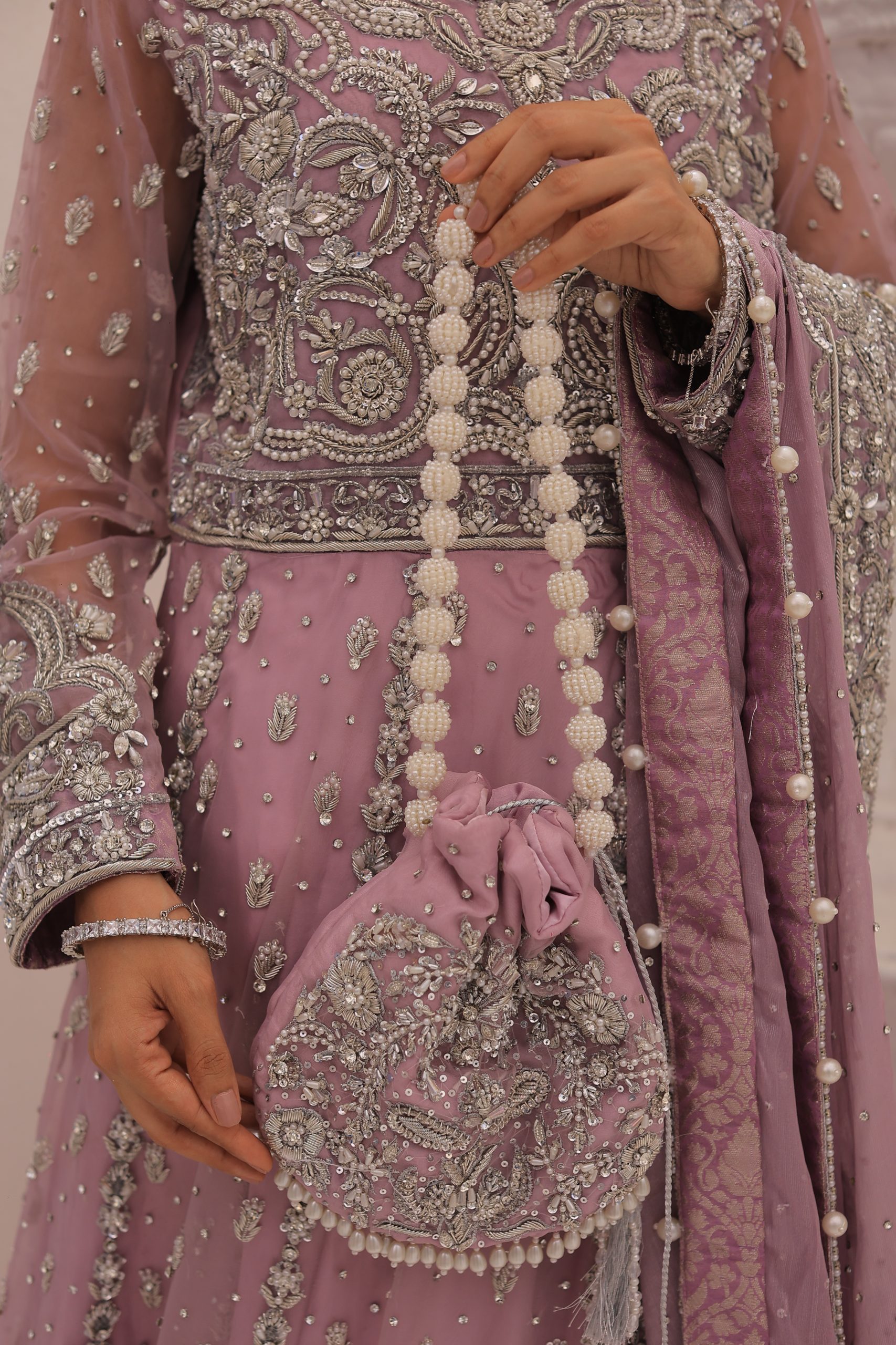 This enchanting lavender bridal maxi dress is crafted from luxurious Kathan organza, offering a graceful and elegant silhouette. This bridal maxi accompanying pure maisuri dupatta complements the dress perfectly. The outfit features a stunning mix of traditional zardozi work with contemporary beads and stones, creating a bejeweled pattern inspired by motifs derived from Persian designs. This intricate and exquisite detailing adds a touch of opulence and sophistication, making this dress ideal for a bride seeking a timeless and memorable look on her special day.