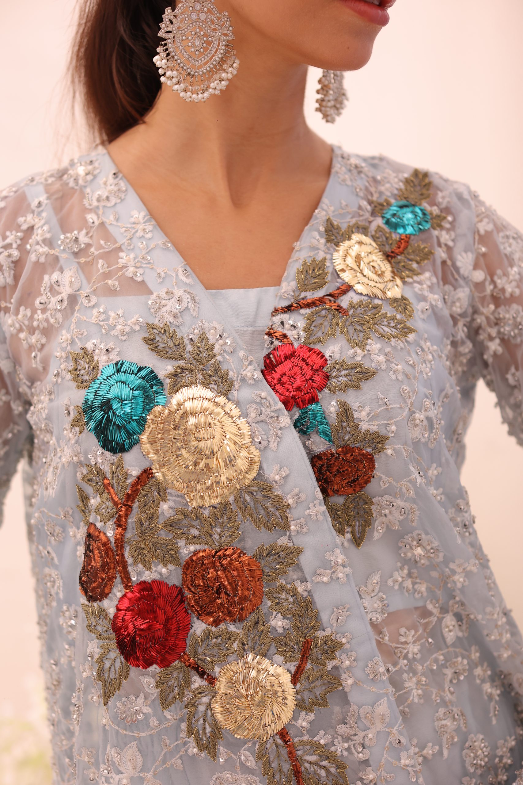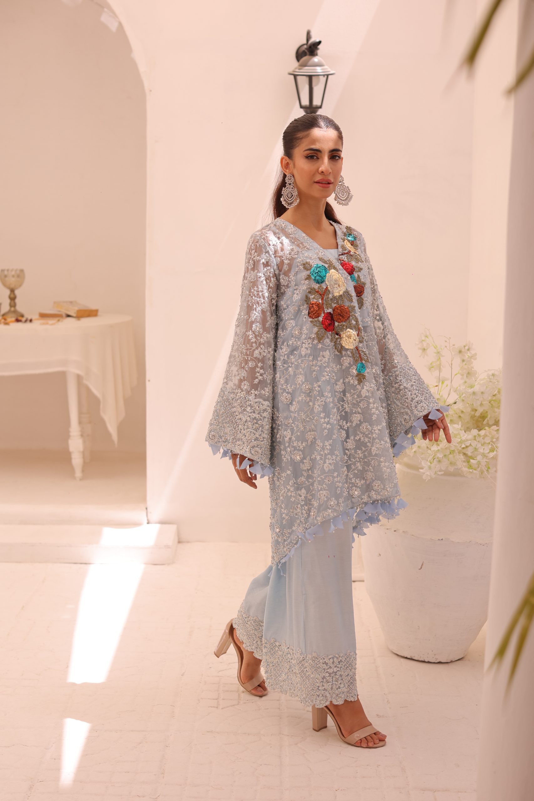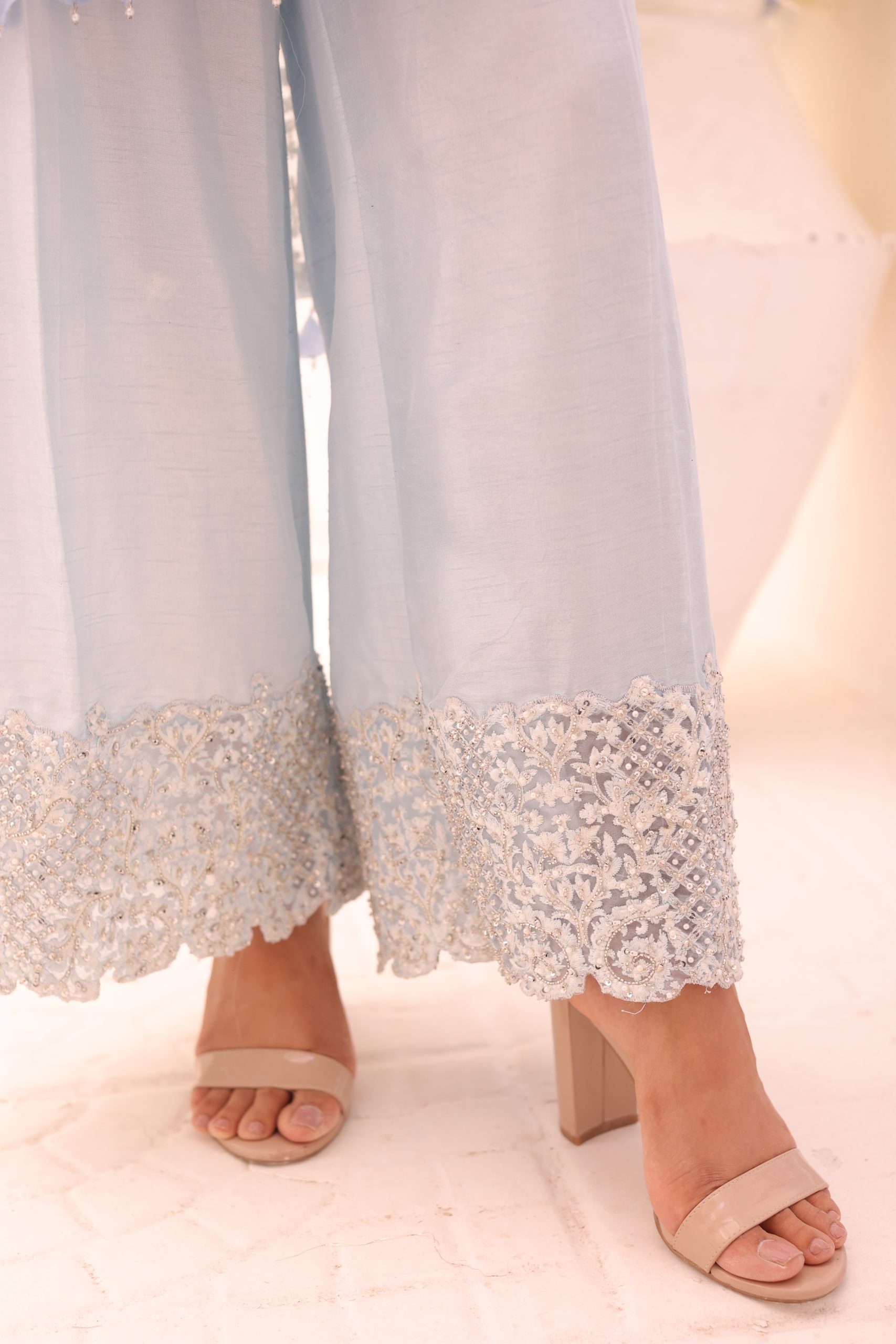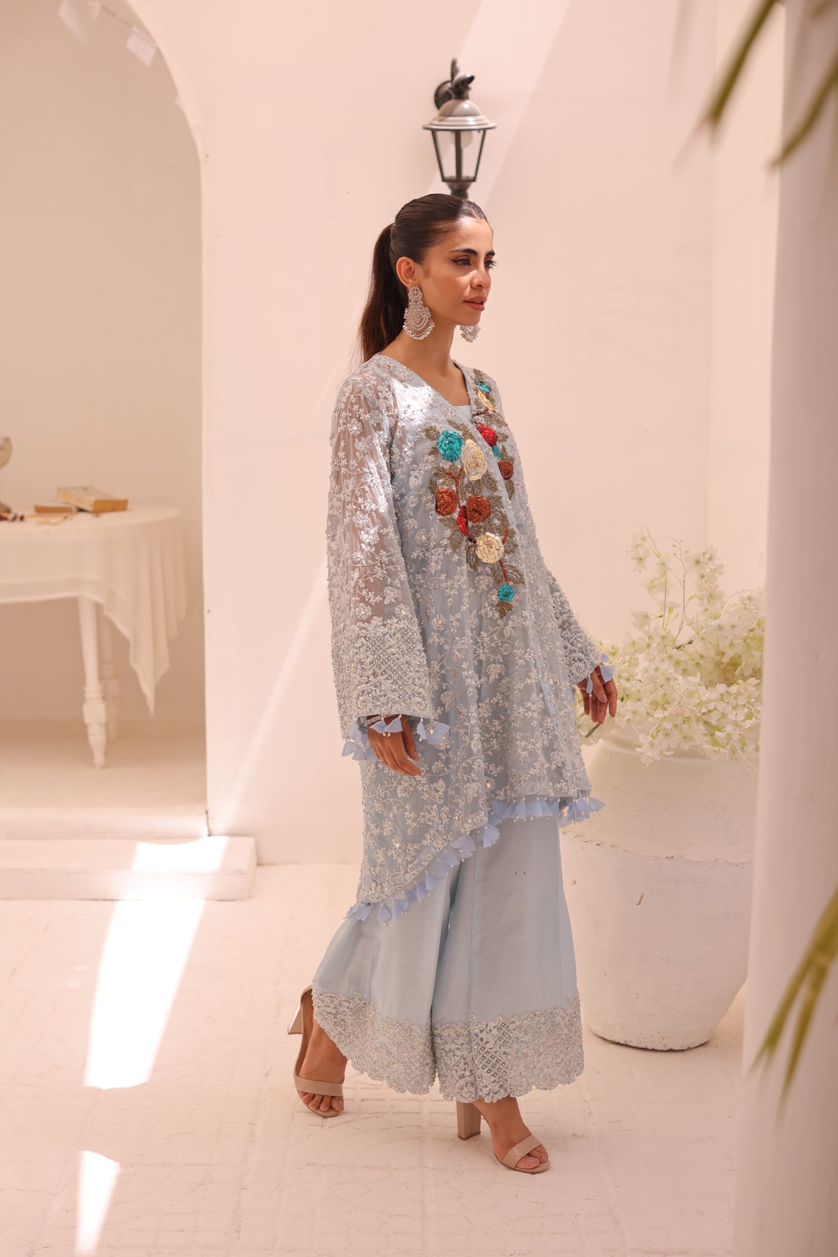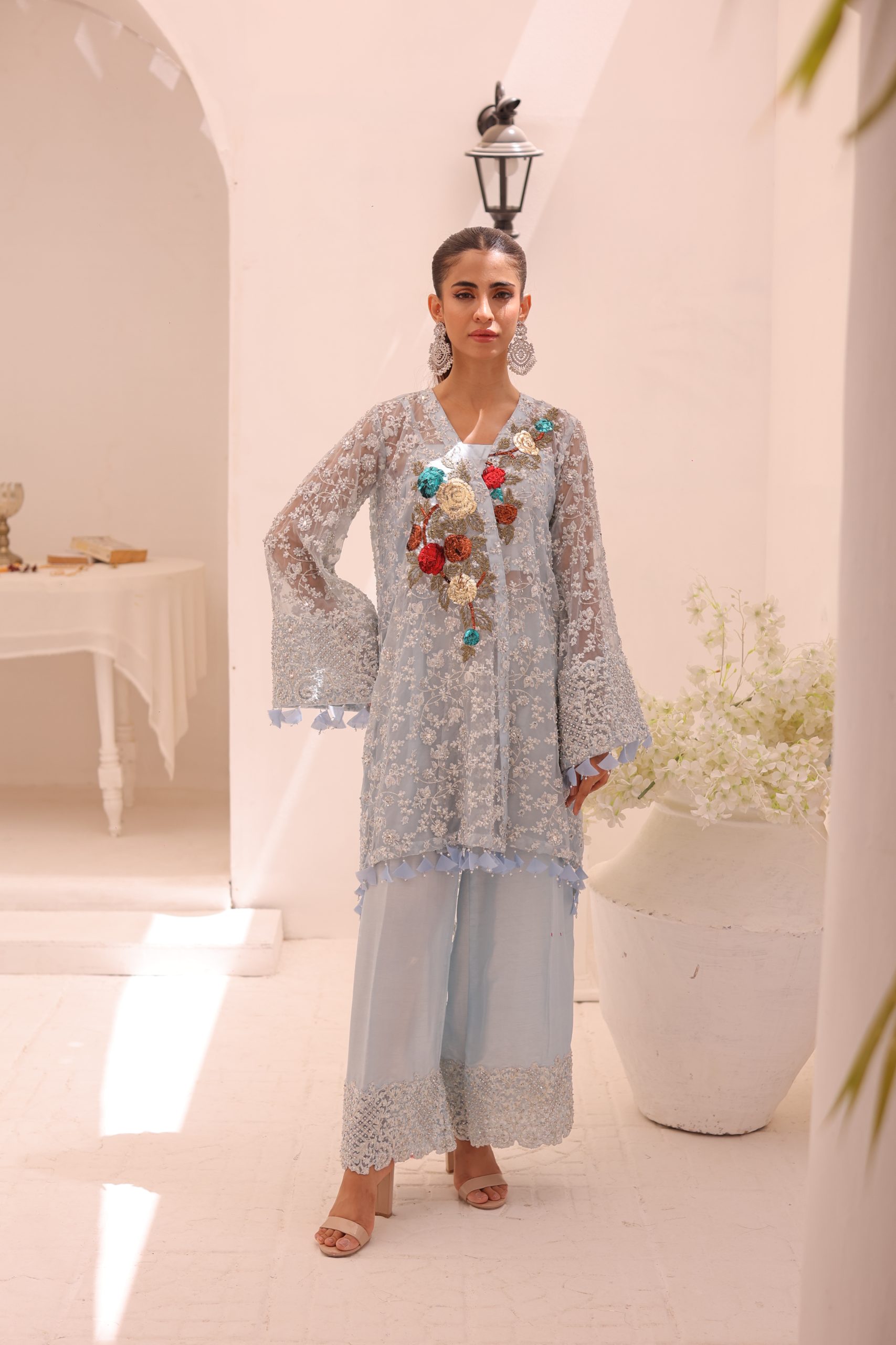 This sophisticated ensemble features a pure Kathan organza wrap, raw silk camisole, and culottes. The top is heavily embellished with Swarovski crystals, beads, pearls, and adorned with bunches of mukesh work flowers, creating a luxurious and dazzling effect. The embellished culottes complement the top perfectly, adding to the overall elegance of the outfit. This stunning set is ideal for special occasions, combining timeless craftsmanship with modern sophistication.