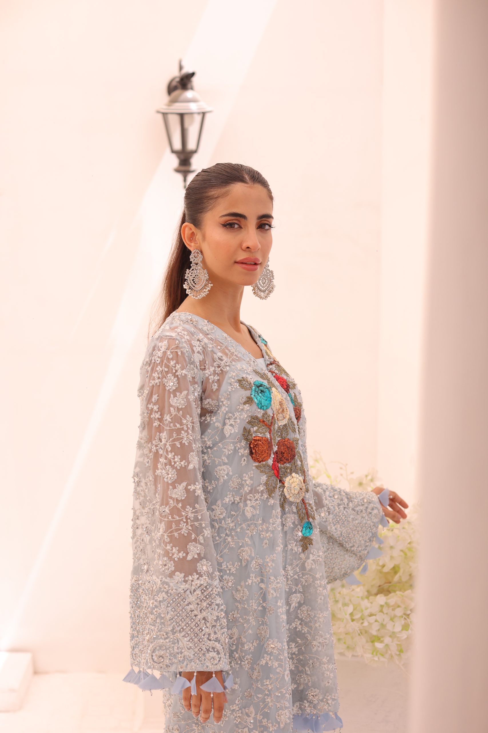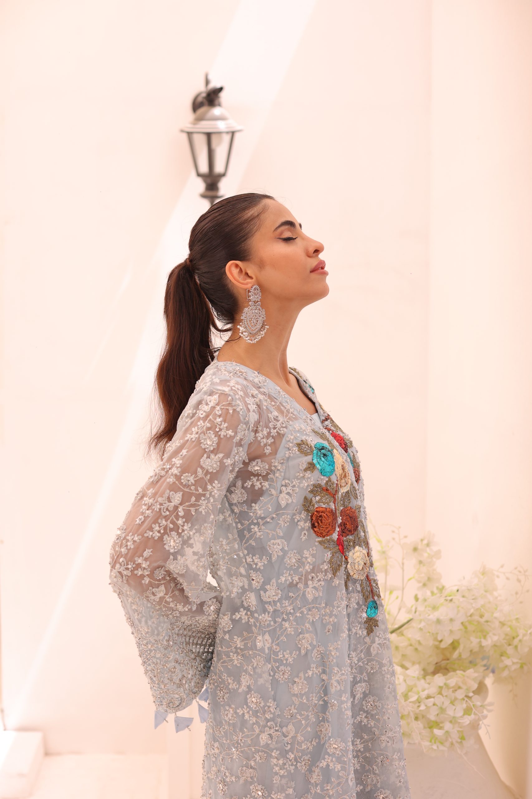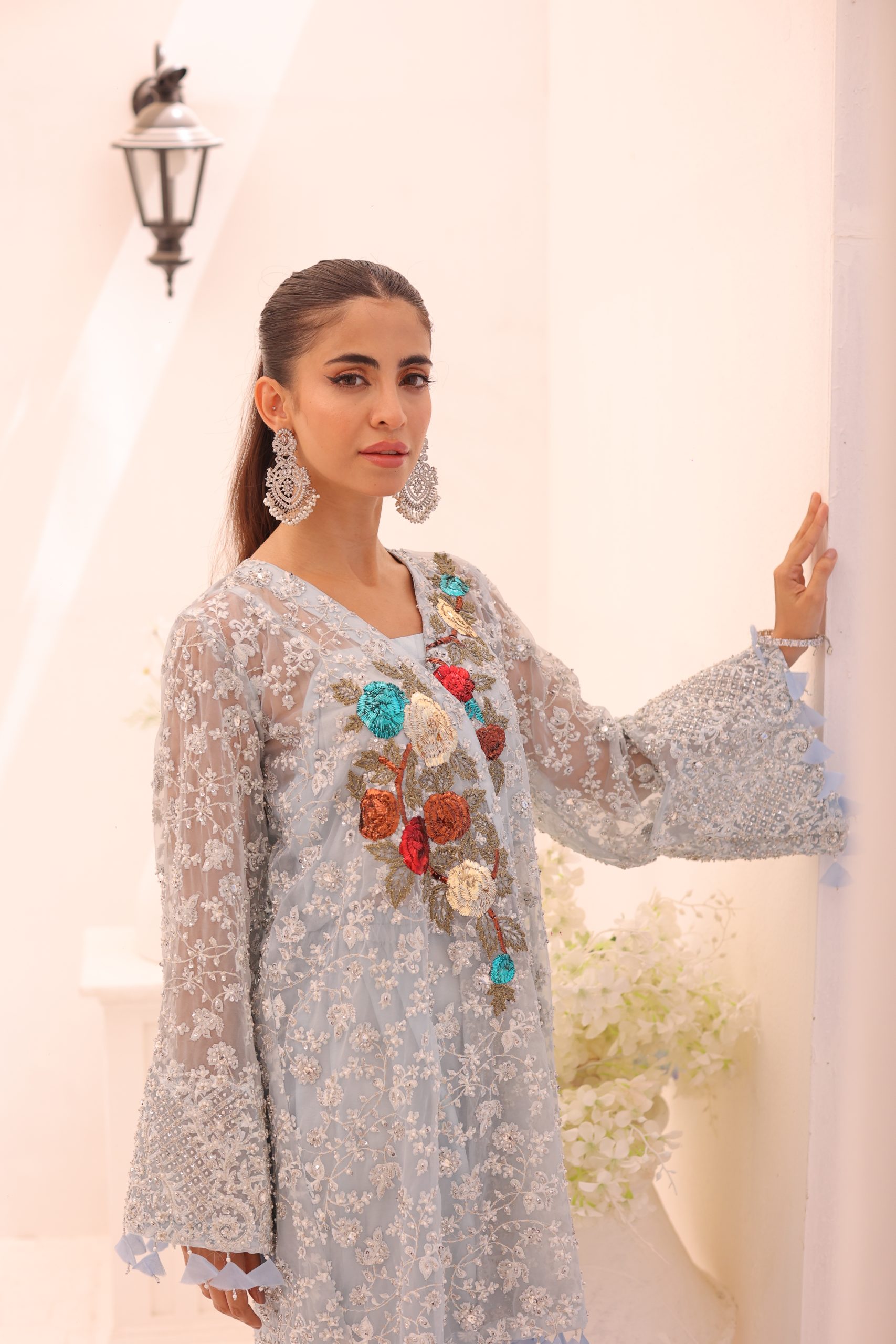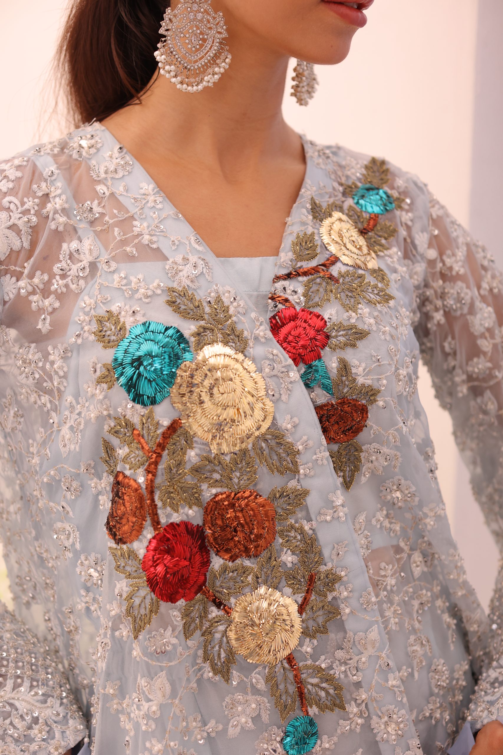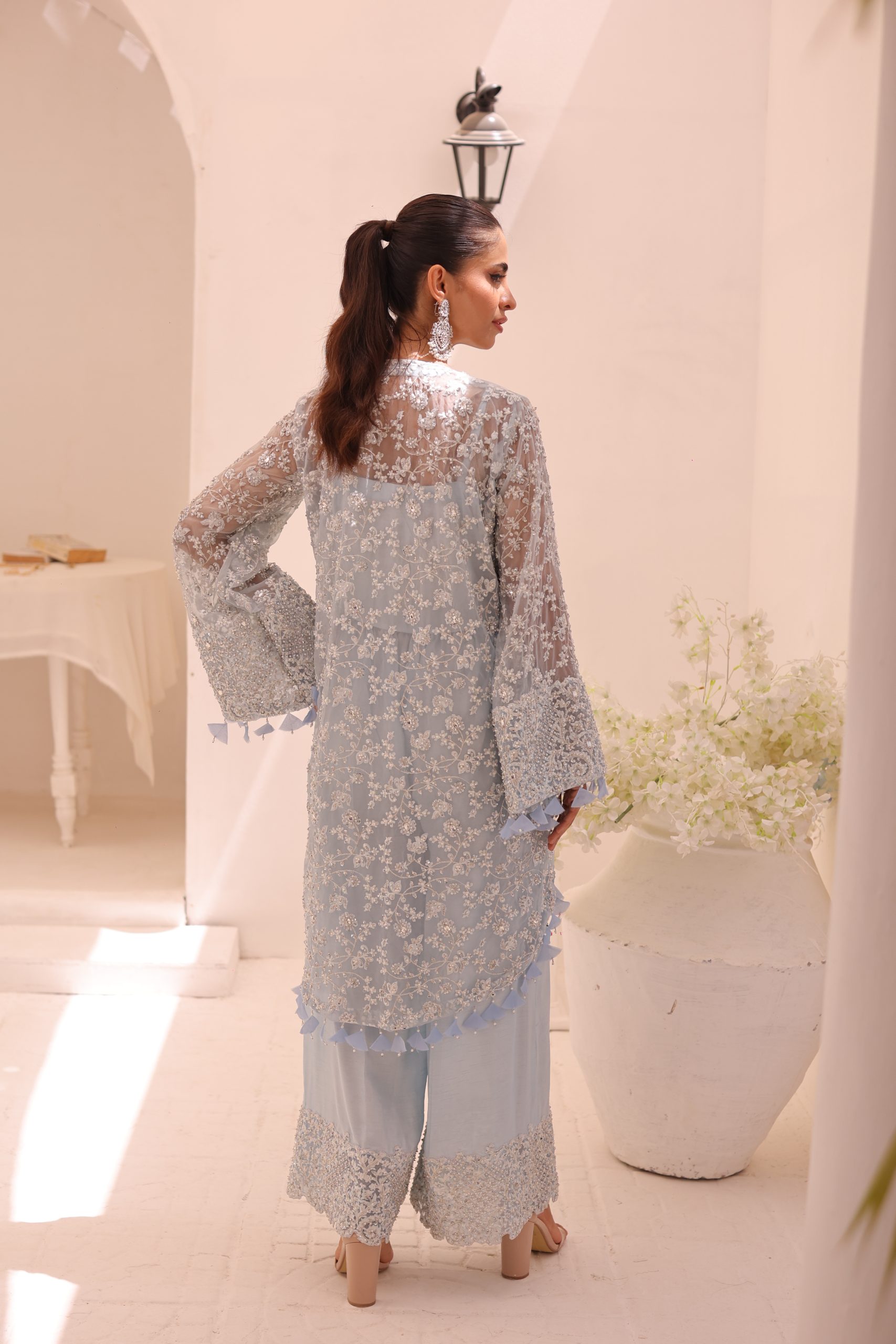 This sophisticated ensemble features a pure Kathan organza wrap, raw silk camisole, and culottes. The top is heavily embellished with Swarovski crystals, beads, pearls, and adorned with bunches of mukesh work flowers, creating a luxurious and dazzling effect. The embellished culottes complement the top perfectly, adding to the overall elegance of the outfit. This stunning set is ideal for special occasions, combining timeless craftsmanship with modern sophistication.
