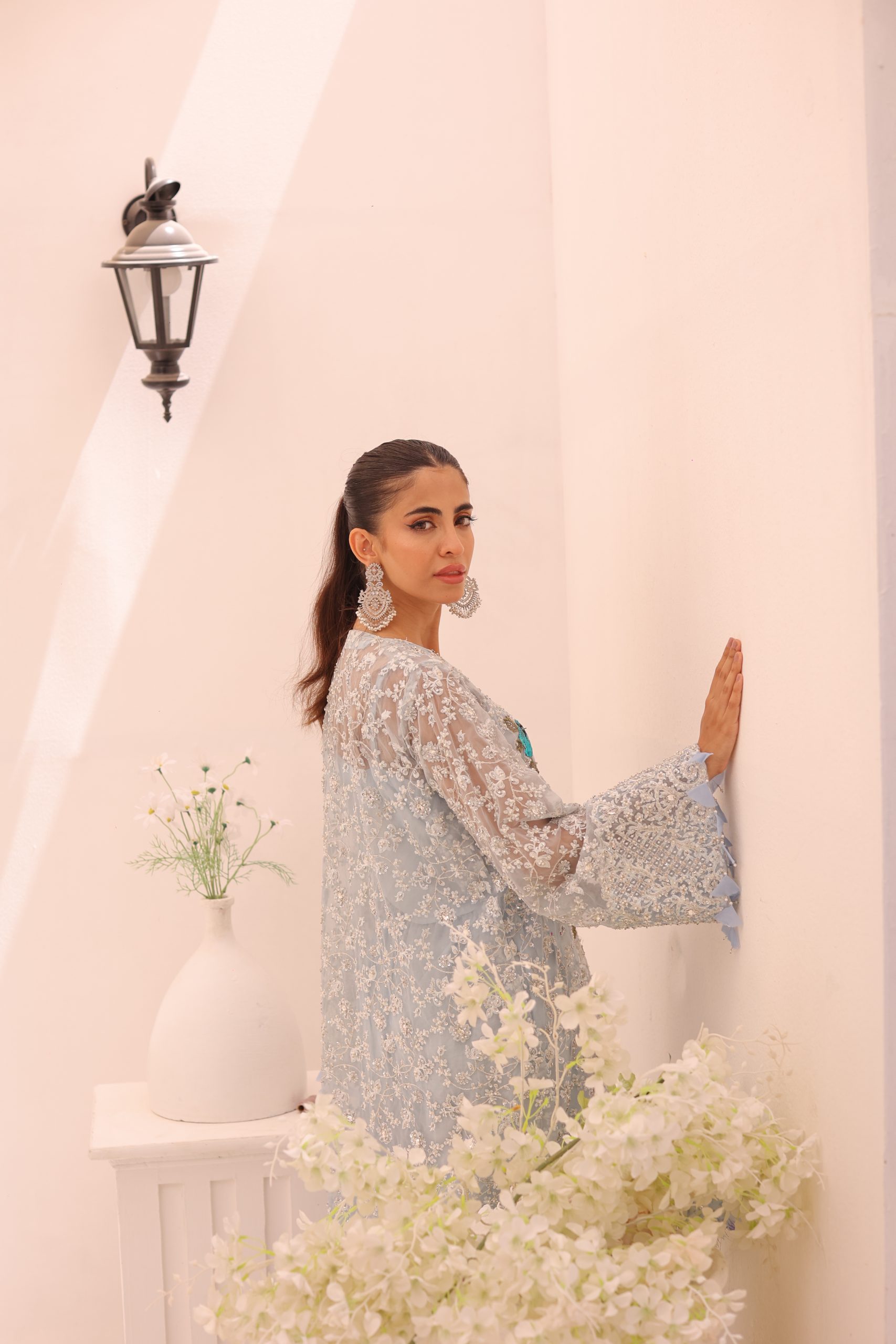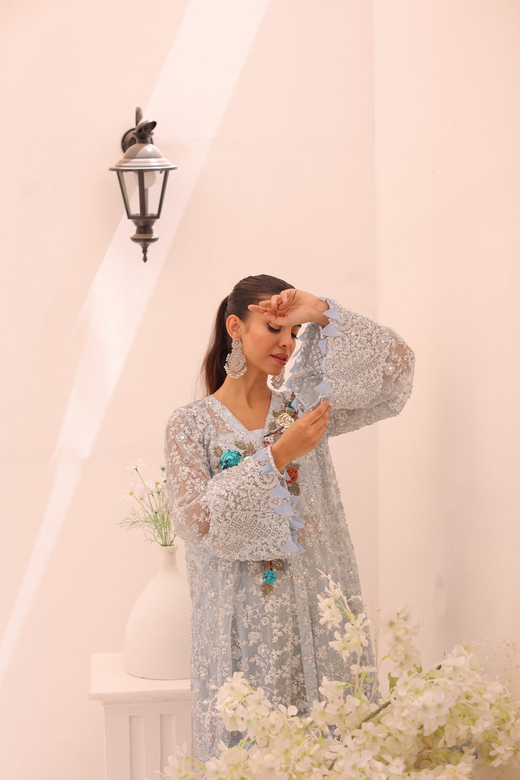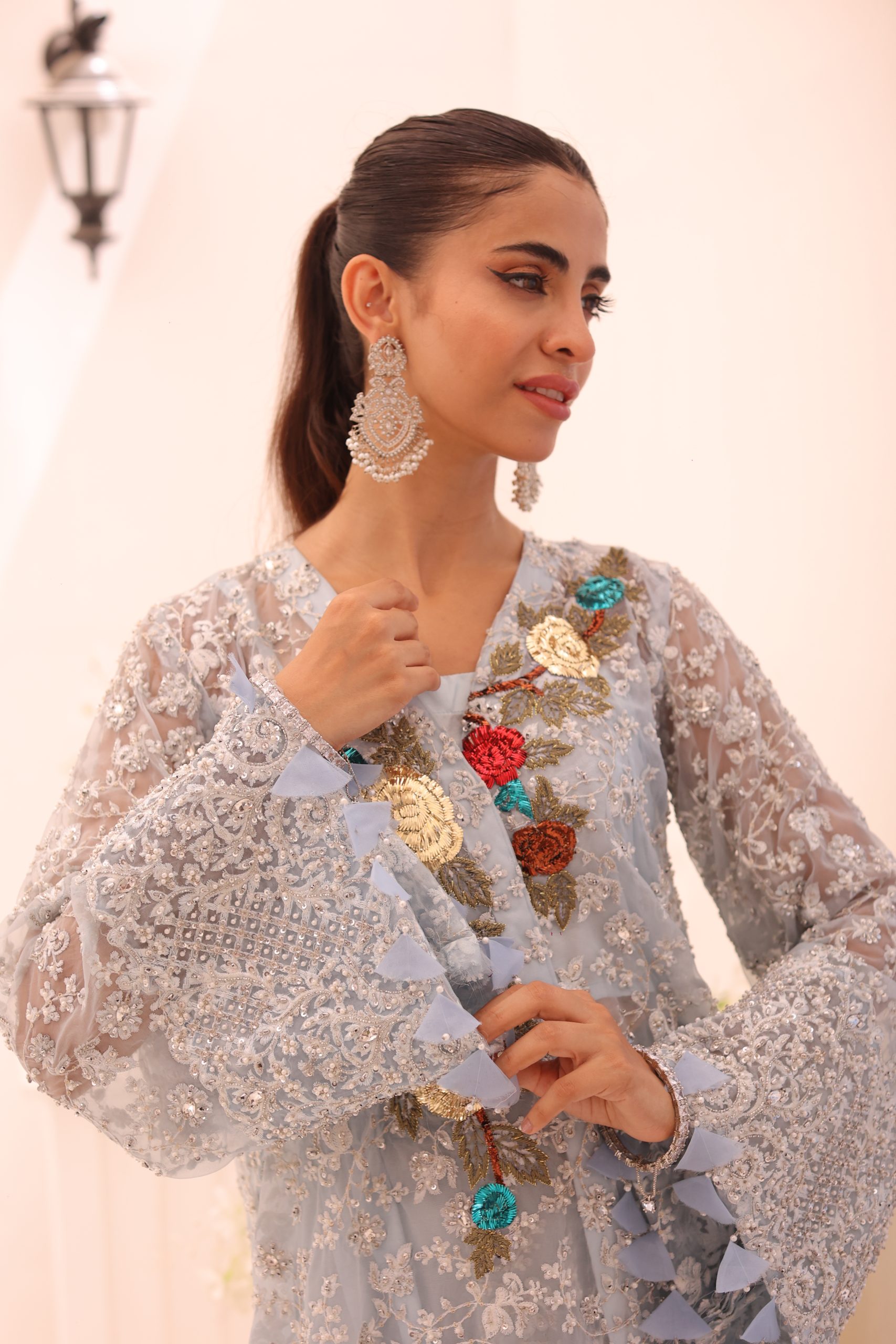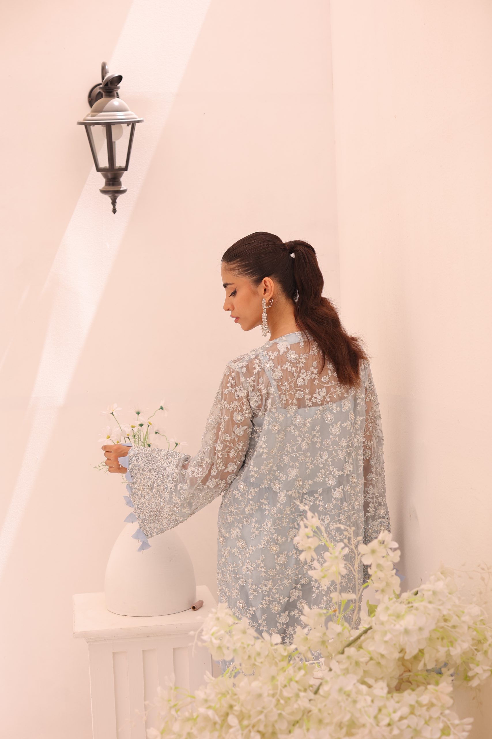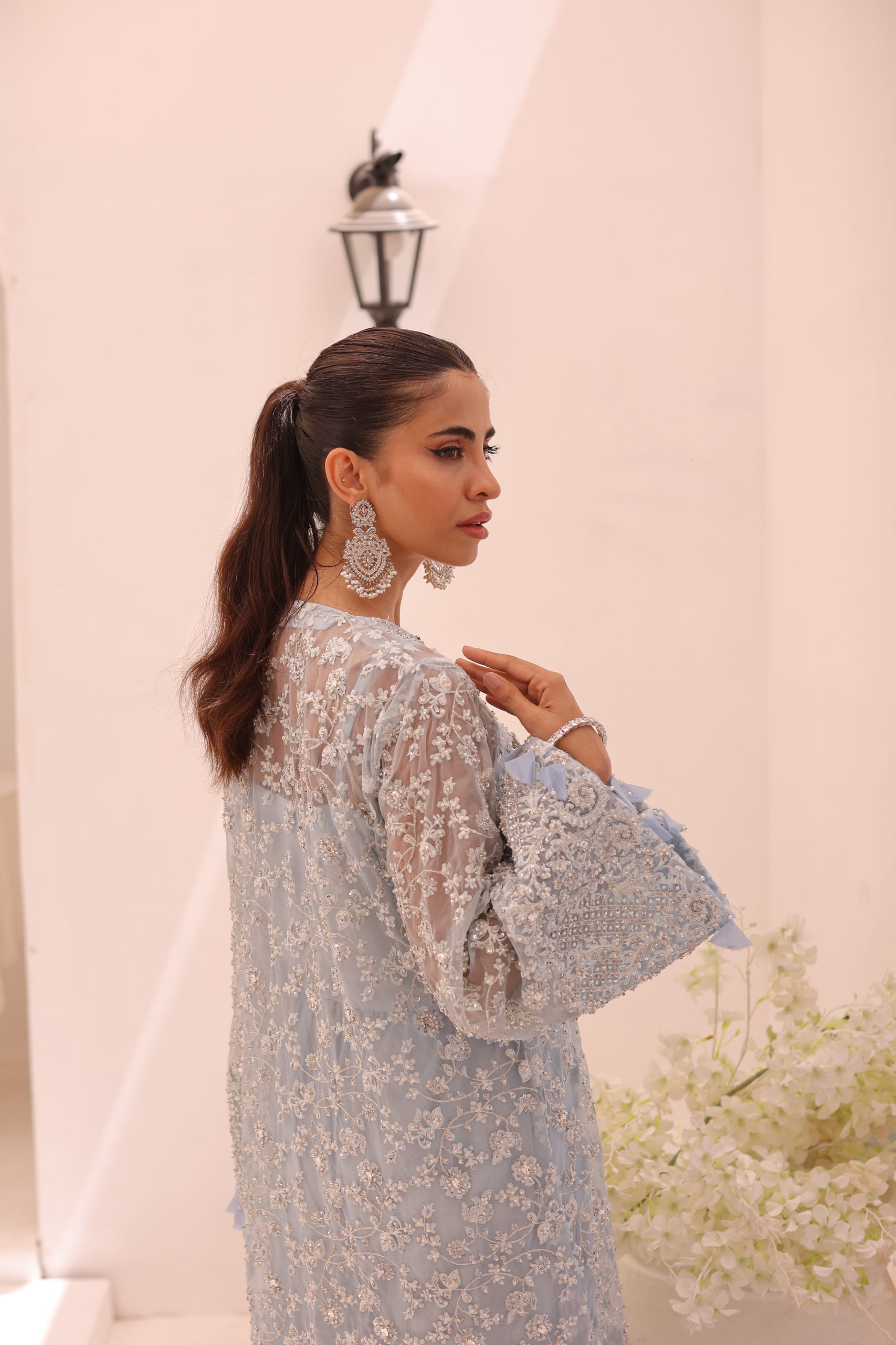 This sophisticated ensemble features a pure Kathan organza wrap, raw silk camisole, and culottes. The top is heavily embellished with Swarovski crystals, beads, pearls, and adorned with bunches of mukesh work flowers, creating a luxurious and dazzling effect. The embellished culottes complement the top perfectly, adding to the overall elegance of the outfit. This stunning set is ideal for special occasions, combining timeless craftsmanship with modern sophistication.
